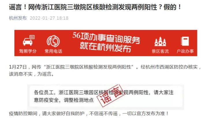 中新网1月27日电 据“杭州发布”微信公众号消息,1月27日,网传“浙江医院三墩院区核酸检测发现两例阳性”。经杭州市西湖区防控办核实,该消息不实,为谣言。