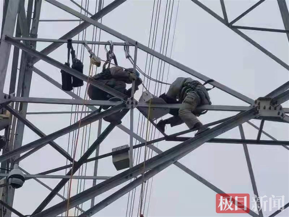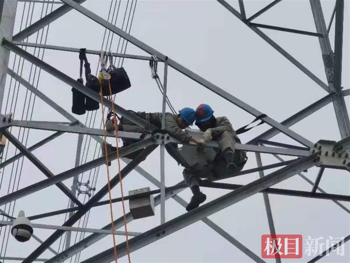 近日,国网湖北送变电工程有限公司输电线路运维人员在寒冬里负重数十斤的工器具下到齐腰深的水塘,对500千伏渔兴三回线498号杆塔进行在线监测设备修复,守护高压电塔的这只“千里眼”。