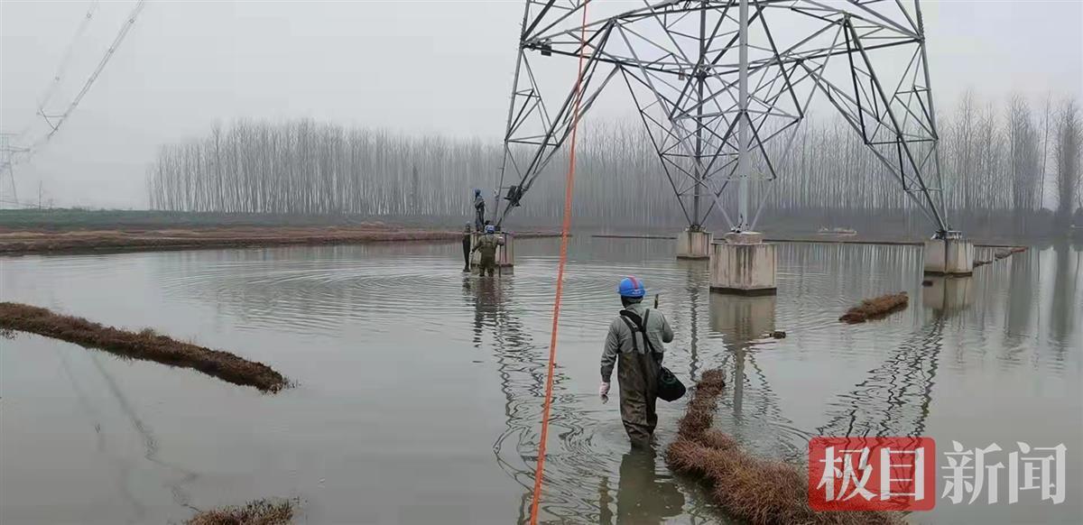 据了解,这只杆塔位于潜江市张金镇某虾塘中,当天是大寒节气,气温低至3℃,在寒风中,作业人员身穿下水裤,负重数十斤的工器具下到水塘里,冰冷刺骨的泥水齐腰深,他们双脚插进淤泥,用尽力气艰难跋涉。