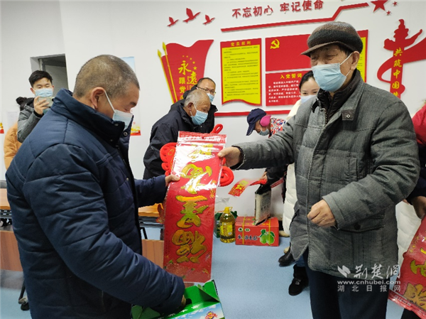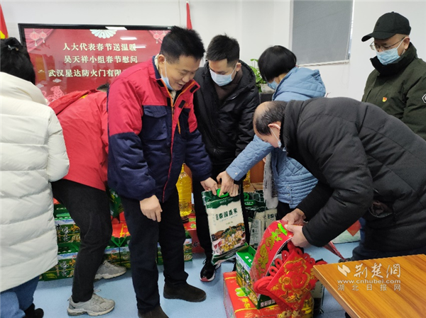 荆楚网(湖北日报网)讯(记者李燕 通讯员补红英)临近春节,为把新春祝福及时送到困难选民手中,1月27日下午,全国道德模范吴天祥、武昌区人大代表石竹武、原武昌区政协主席刘君、区政协委员石植来到紫阳街道梅隐寺社区慰问困难选民,送去米、油、鸡蛋等生活物资。紫阳街道工委书记袁卫明、区人大紫阳街道工委主任余继芳陪同参加。