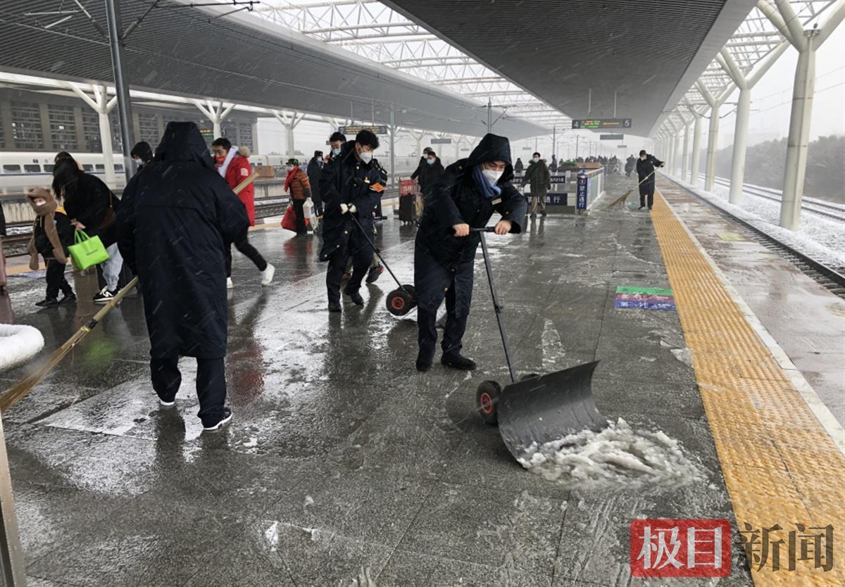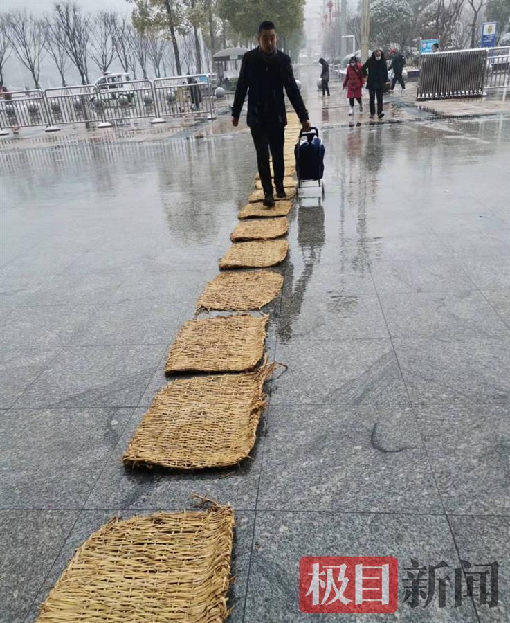 在荆州火车站,工作人员及时出动,手持除雪设备,在春运旅客的通道处铺设草垫,防止旅客摔倒。与此同时,他们还对站台的积雪进行了及时清理,确保旅客春运出行安全。