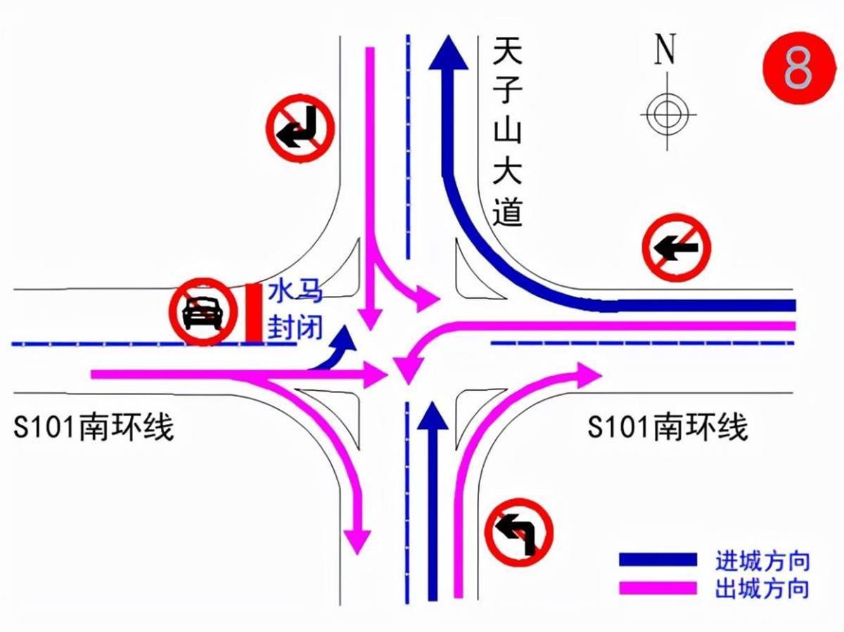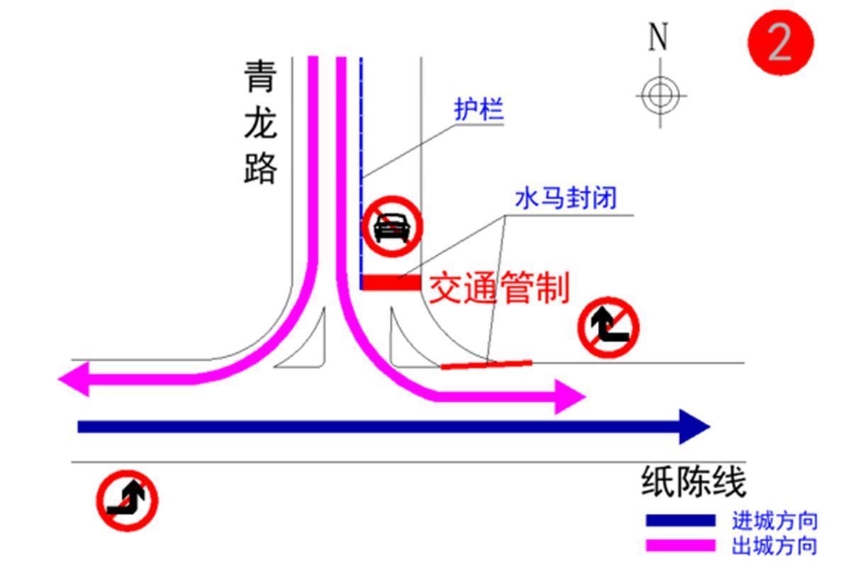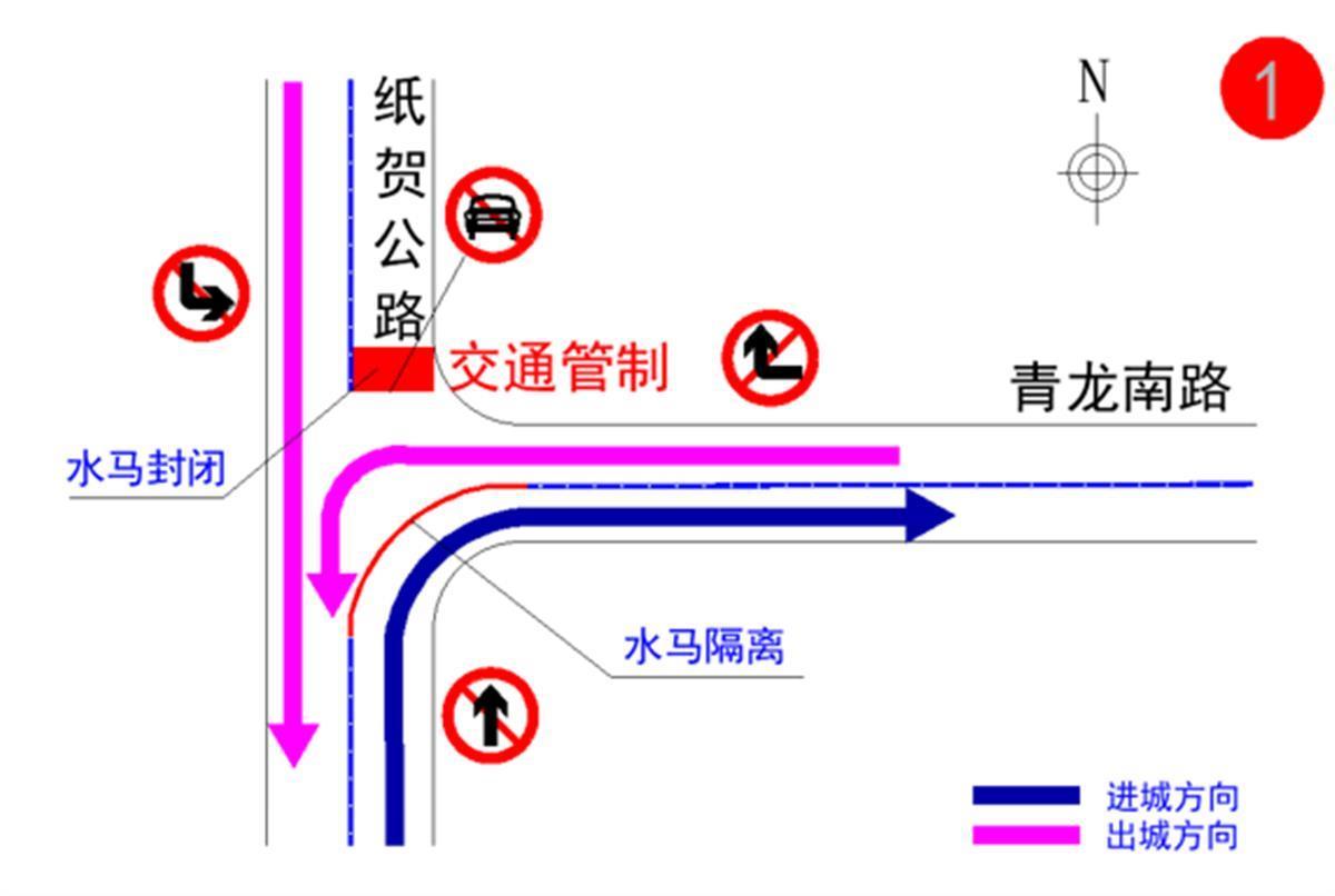 (一)纸贺线与青龙南路路口:南往北方向禁止机动车直行、东往西方向禁止机动车右转、北往南方向禁止机动车左转。进城车辆可通过纸陈线、天子山大道绕行。