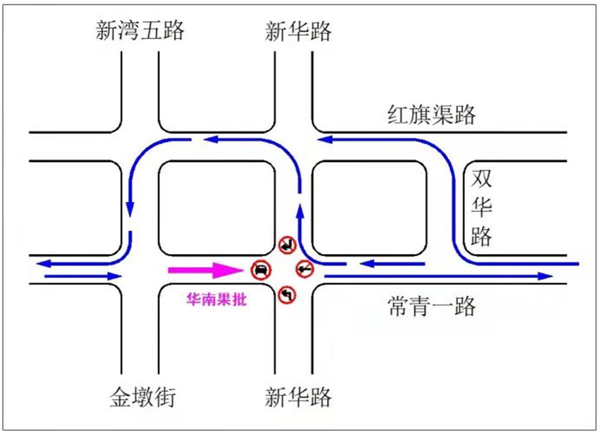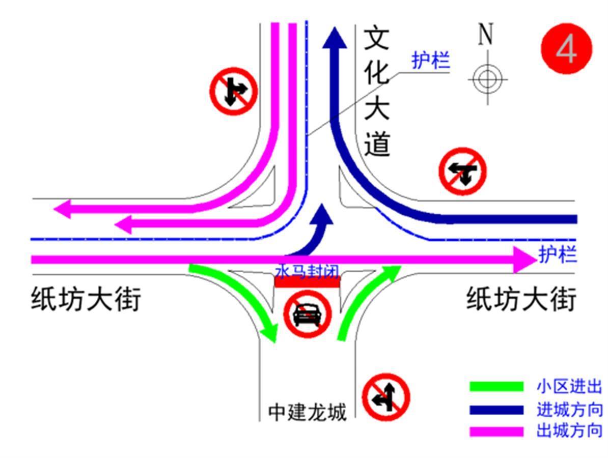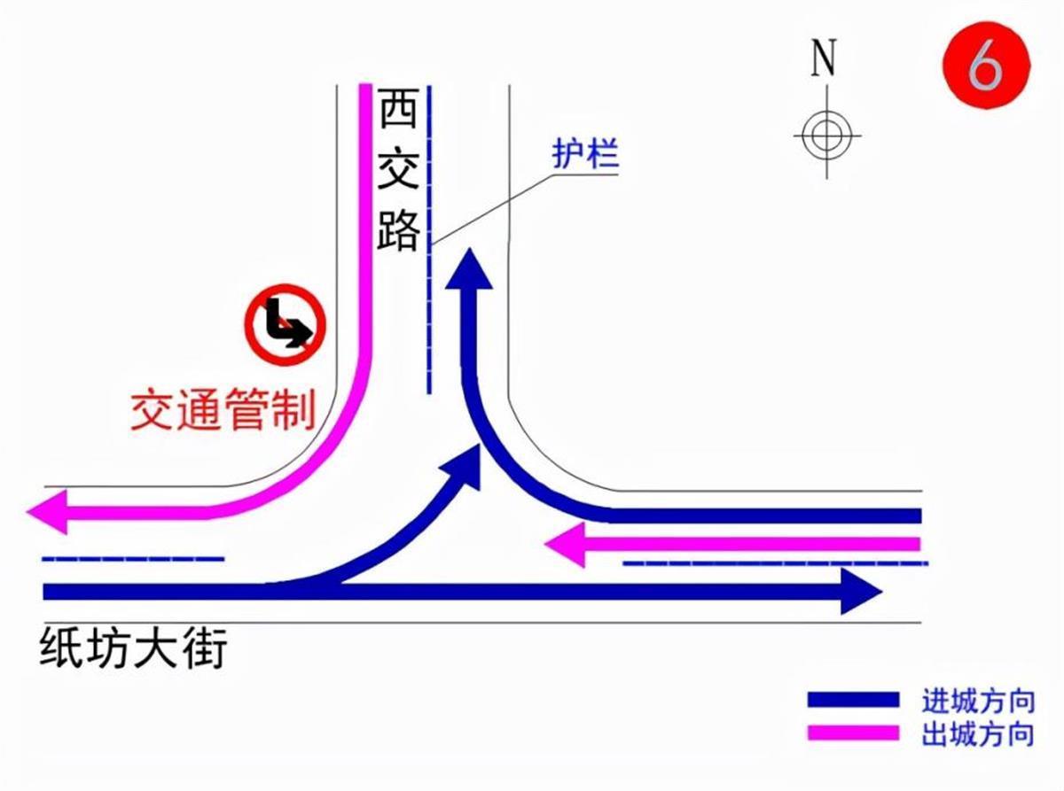 (五)纸坊大街与文化大道路口:南北双向(文化大道方向)禁止机动车直行和左转、东往西方向禁止机动车直行和左转。
