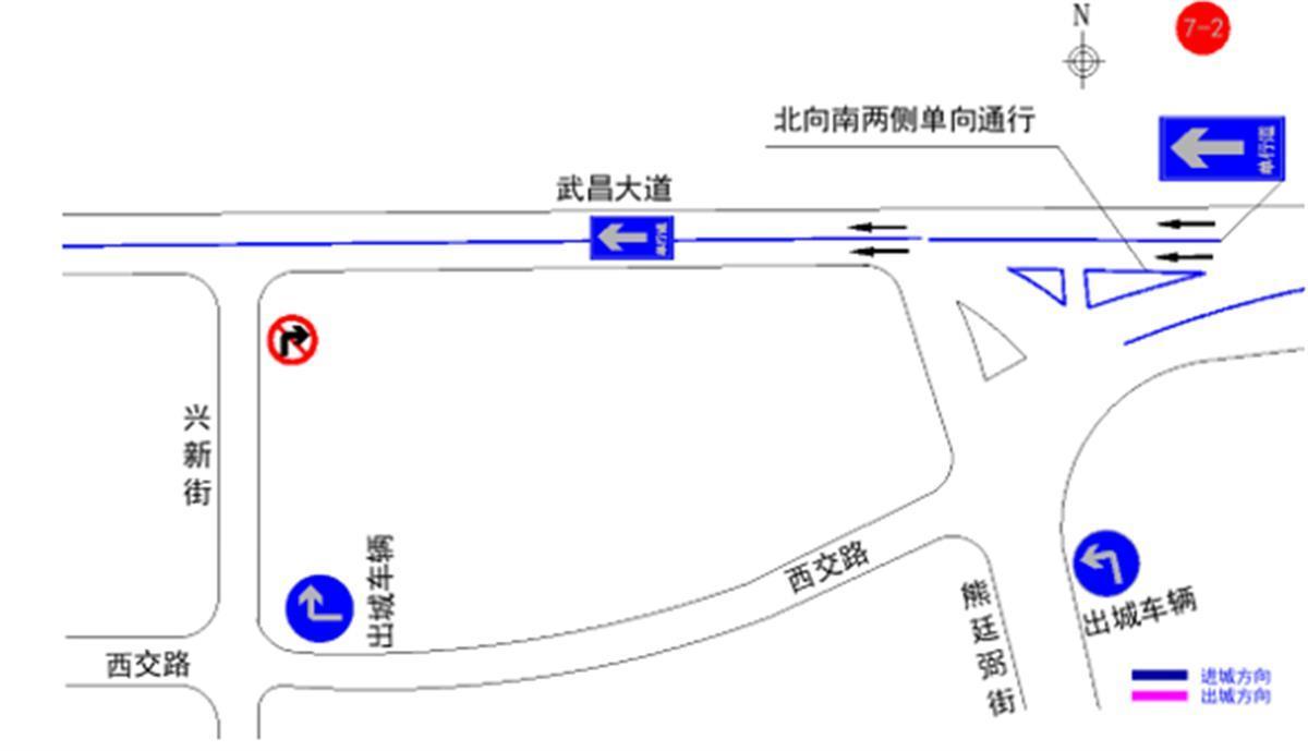 (八)武昌大道(熊廷弼路至纸坊大街):实行机动车由北往南单行通行。
