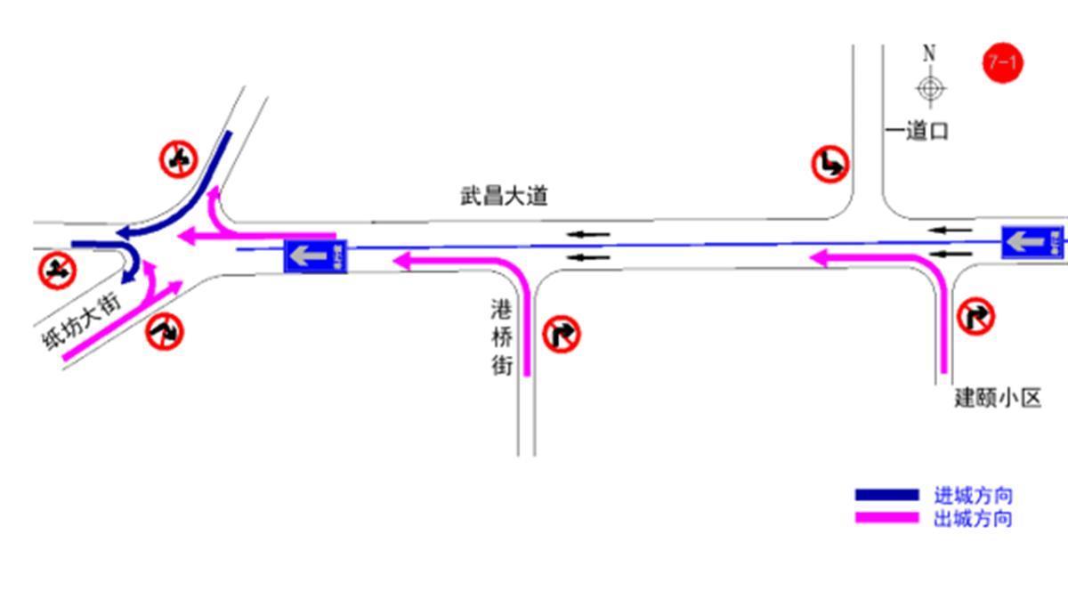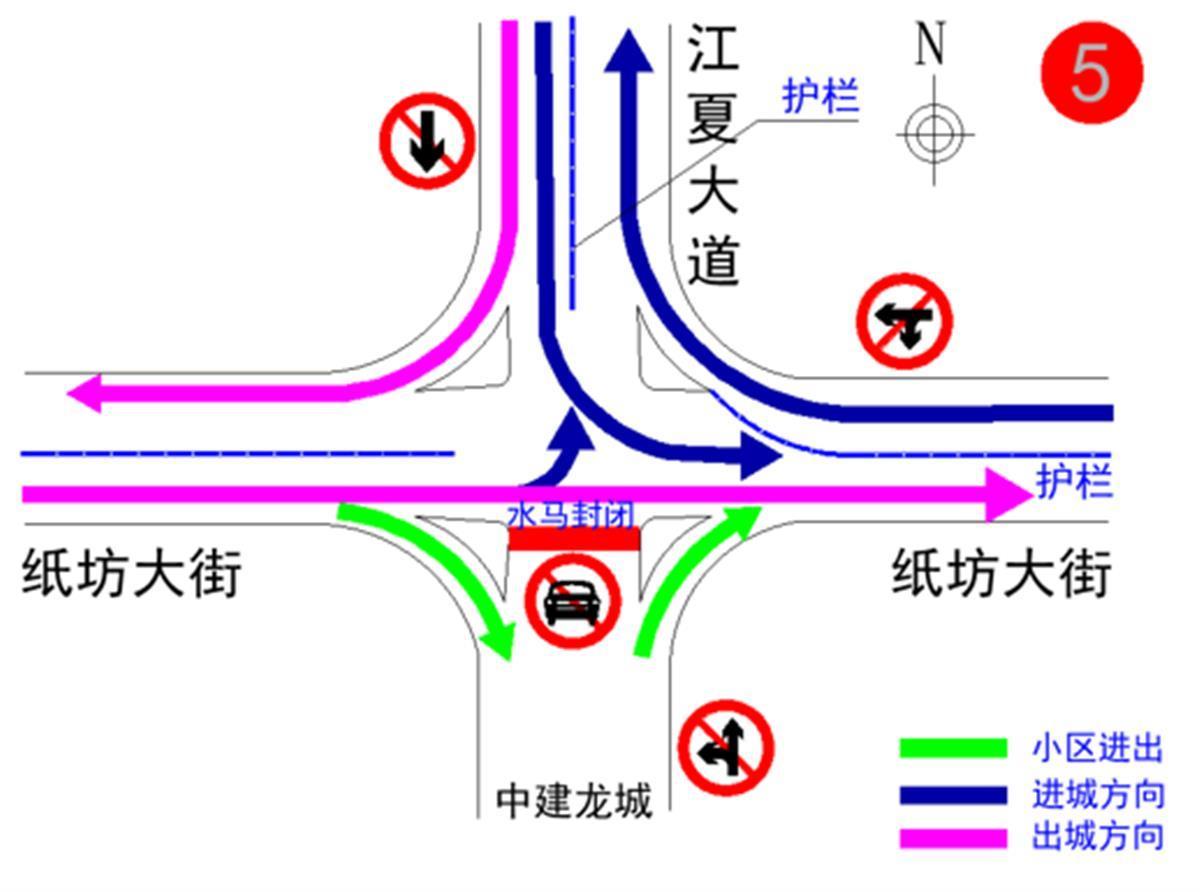 (六)纸坊大街与江夏大道路口:南往北方向(江夏大道方向)禁止机动车直行和左转、北往南方向禁止机动车直行、东往西方向禁止机动车直行和左转。
