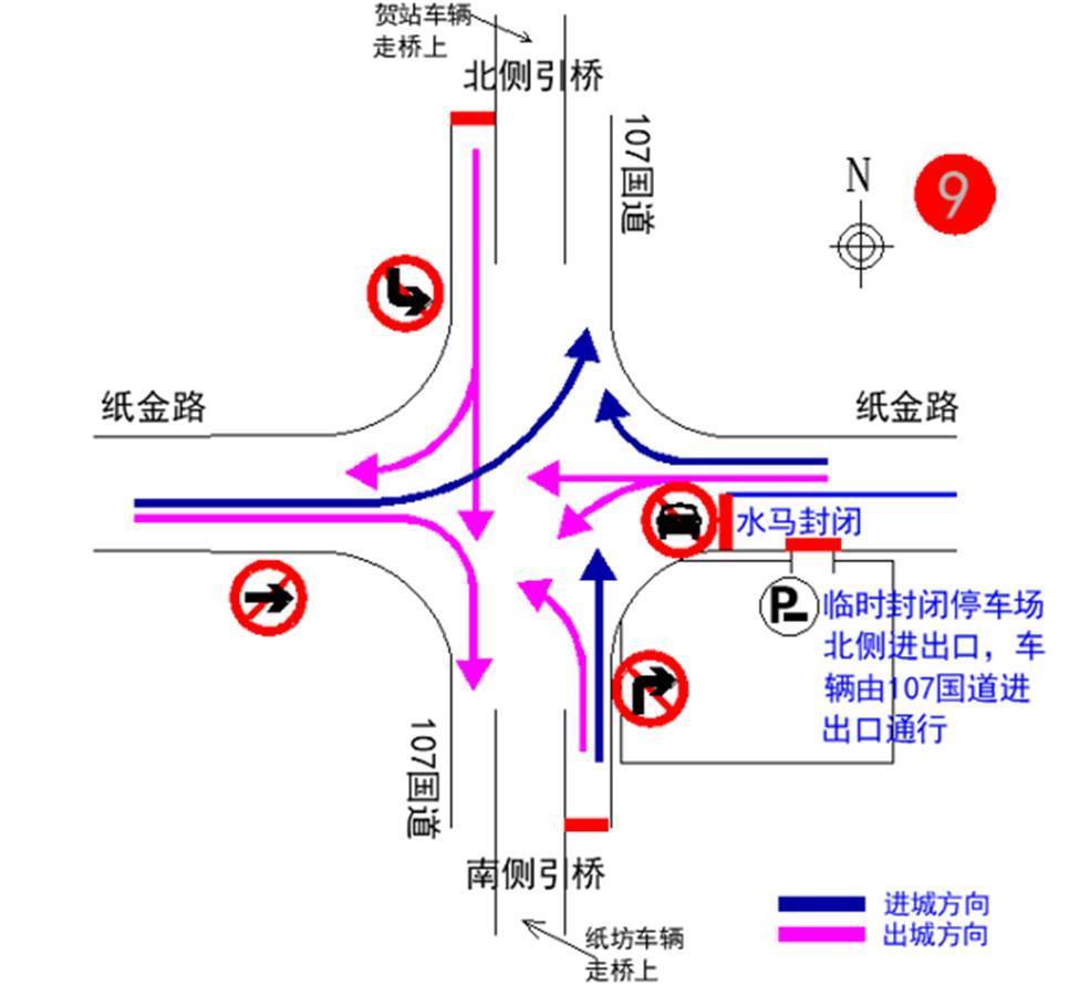 (十)纸金路与107国道路口:南往北方向禁止机动车右转、西往东方向禁止机动车直行、北往南方向禁止机动车左转。金口及南部乡镇到纸坊方向的车辆绕行金龙大街。
