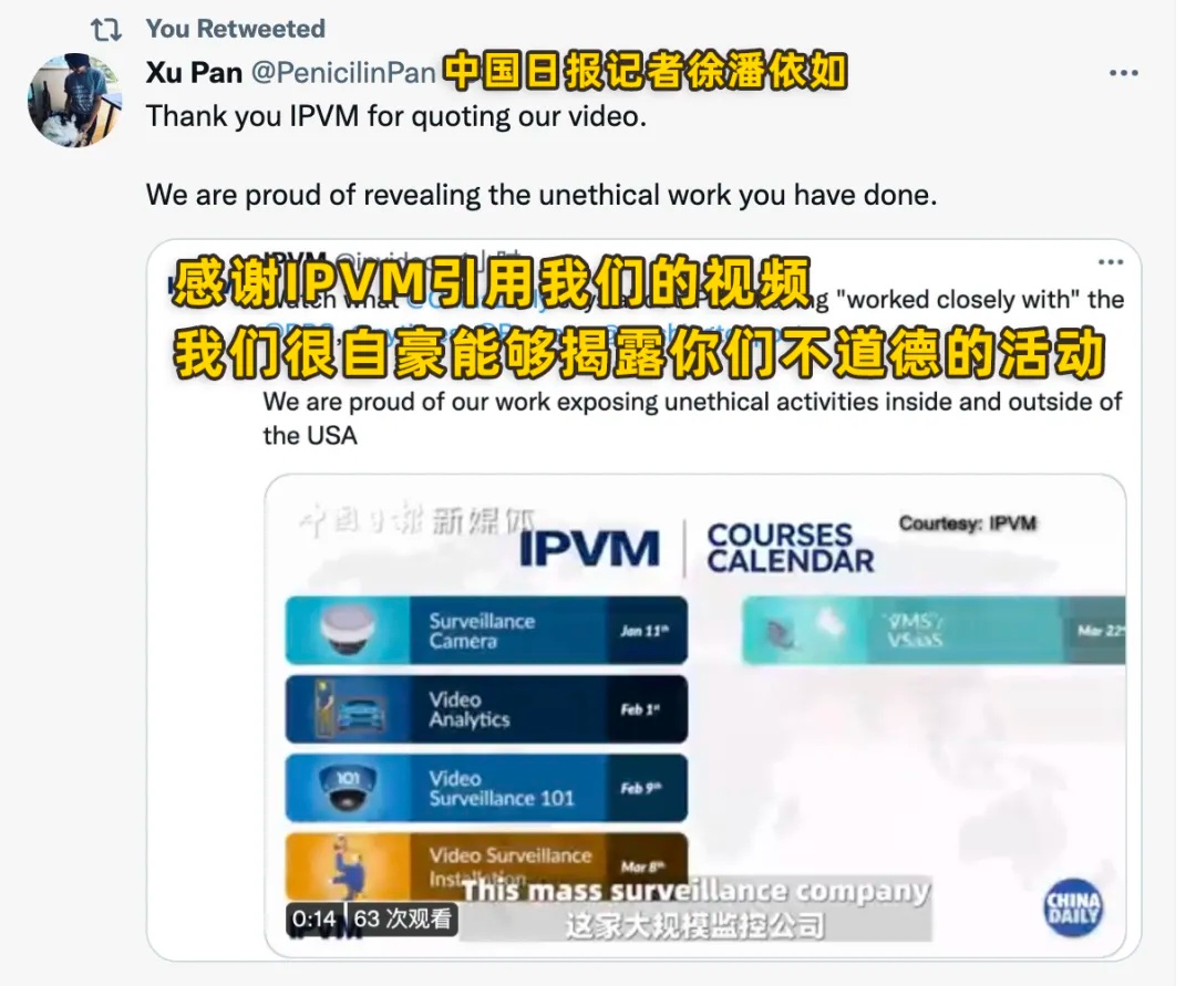 ▲ 该调查报道作者之一、中国日报记者徐潘依如回应IPVM推文的截图