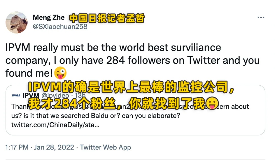 ▲ 中国日报记者孟哲回应IPVM推文的截图