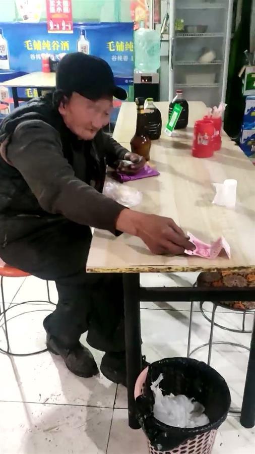 受访者提供的视频显示,一位老人坐在小餐馆里,从一把零钱中拿出一张100元,执意要给餐馆老板。餐馆老板一边拍摄一边说:“这个老大爷在我家吃了两年多的饭,这是他非要给我两个女儿的压岁钱,还说一个孩子五十元。”
