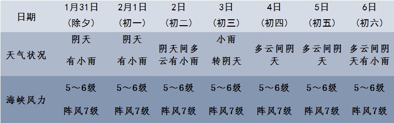 海洋方面:琼州海峡,1月31日~2月1日和2日夜间~6日,风力5~6级、阵风7级;2日白天,风力5级、阵风6级。