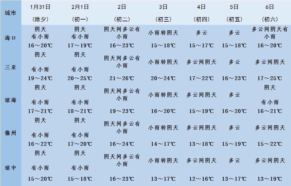 新海南客户端、南海网、南国都市报1月29日消息(记者 姚皓 通讯员 许嘉 翁小芳 李凡)2022年新春佳节将至,记者从海南省气象台了解到,预计春节假日期间1月31日~2月6日(除夕~正月初六),受冷空气影响,海南省前期多阴雨天气;中后期以多云天气为主,气温较低,最低气温中部山区10~13℃,其余地区14~18℃。具体天气预报如下:
