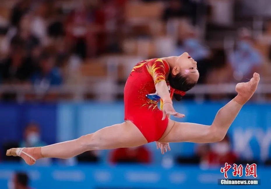 东京奥运会体操比赛结束女子团体决赛较量,中国队排名第七位。图为唐茜靖在自由操比赛中。中新社记者 杜洋 摄