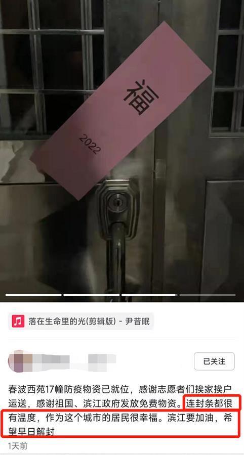 30日上午,发布该图片的居民何女士(化姓)告诉极目新闻记者,因为该楼栋有人员是密接者,所以大家得居家隔离。不过,社区志愿者挨家挨户发放免费物资,连封条都很有温度,她作为生活在这个城市的居民感到很幸福。