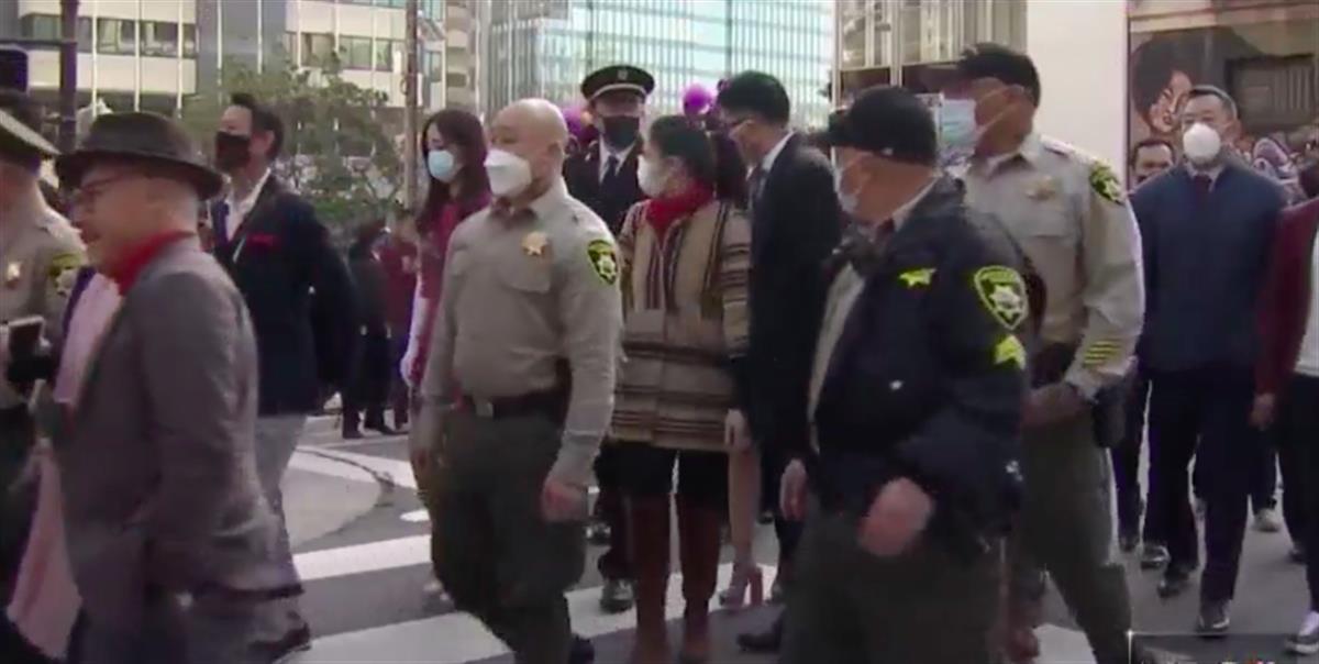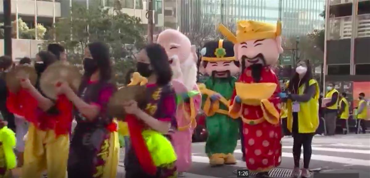 通过NBC的镜头,极目新闻记者看到,周六上午,一支小型游行队伍沿着唐人街格兰特大道(Grant Avenue)行进。游行队伍里,有大人和小孩穿着中国风的衣服跳扇子广场舞,有人敲锣打鼓迎福星、禄星、寿星,有人表演着中国功夫……几名美国警察跟在游行队伍后面护送,确保安全。