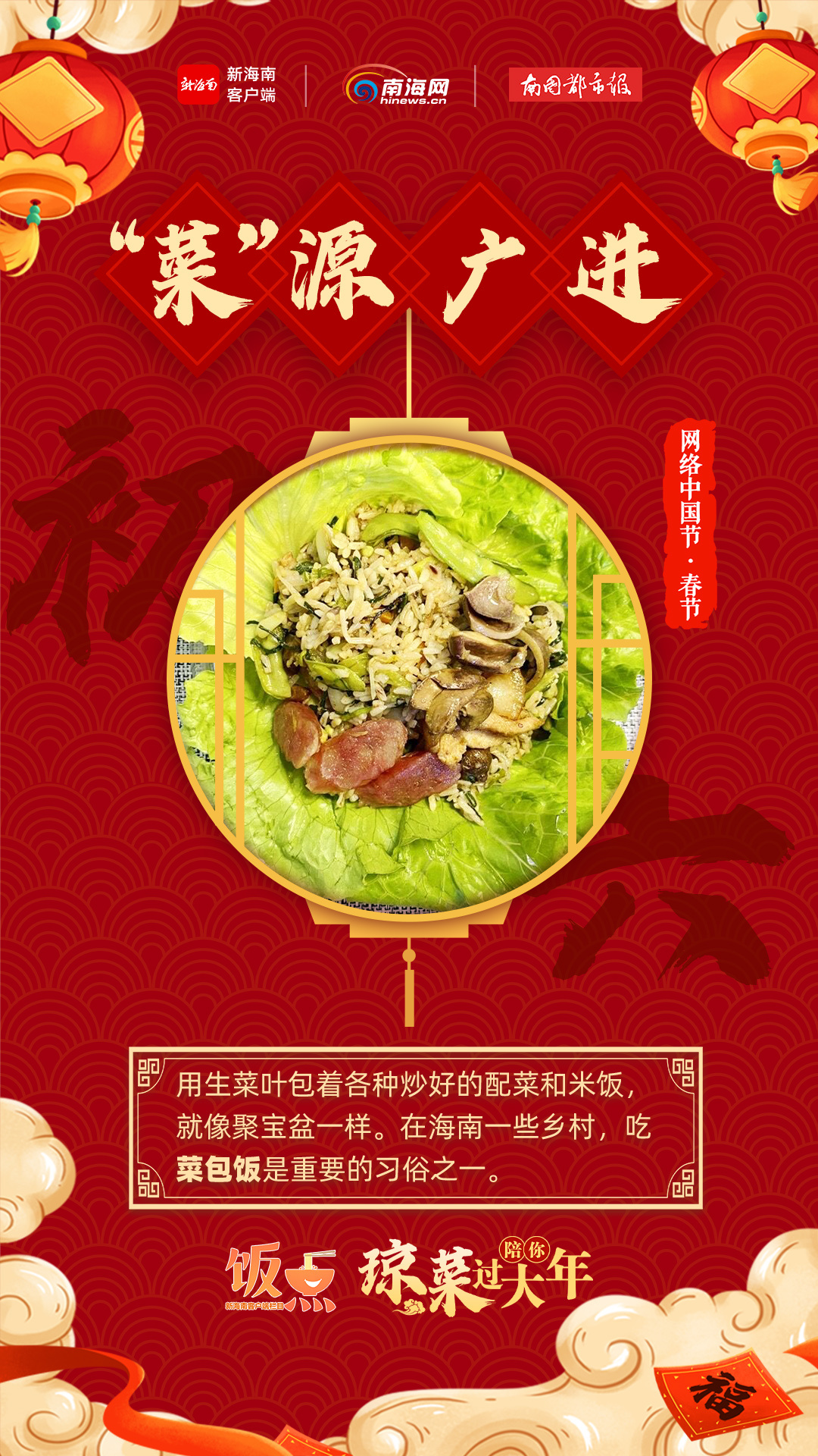 用生菜叶包着各种炒好的配菜和米饭,就像聚宝盆一样。在海南一些乡村,吃菜包饭是重要的习俗之一。