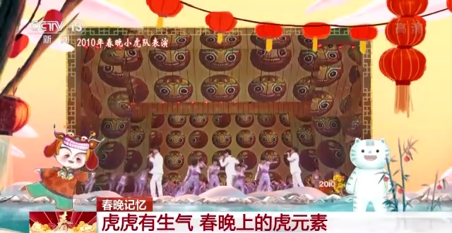 这是2010年虎年春晚的开场舞《龙腾虎跃报春来》,舞台上的这些可爱的“小老虎”来自空军蓝天幼儿艺术团,这些孩子最小的4岁,最大的五岁半,他们头戴虎头帽,脚穿虎头鞋,衣服上绣着布老虎的图案,显得格外喜庆。在同年春晚上,舞蹈《玩具店之夜》中一辆玩具老虎车在一群卡通小老虎的簇拥下开上了舞台,给小朋友们带来惊喜。