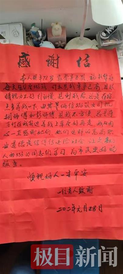 渐渐地,在彭媛、胡小芳的影响和带动下,线路其他驾驶员也加入到“喊一声”队伍中来。公交人的暖心服务,让陈爹爹分外感动,1月29日,乘客特意请会书法的好友帮忙,用红纸手写了一封感谢信,点赞武汉公交的暖心服务。