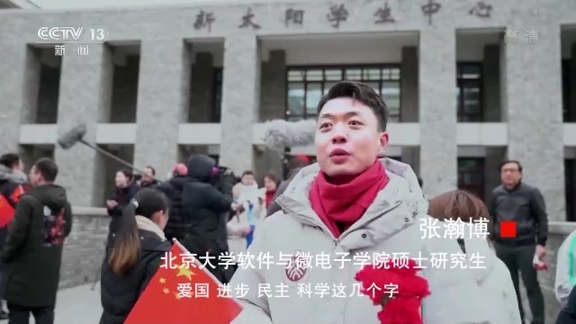 北京大学软件与微电子学院硕士研究生 张瀚博:入学以来,爱国、进步、民主、科学这几个字,已经深深地流入到我们血脉里,那么在以后的生活里,我也想借着这首歌,将这八个字真正地求实力行。