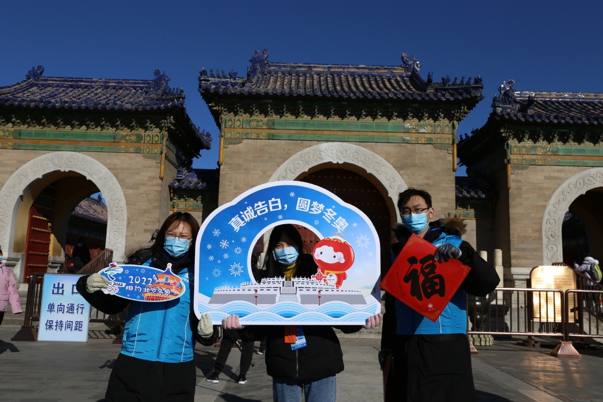 2月1日,北京冬奥城市志愿者在北京天坛公园祈年殿前为冬奥加油祈福。 中国日报记者 武晓慧 摄