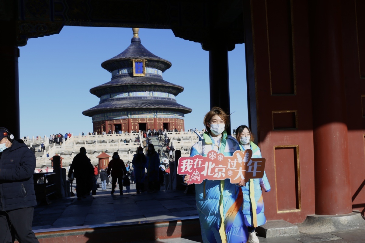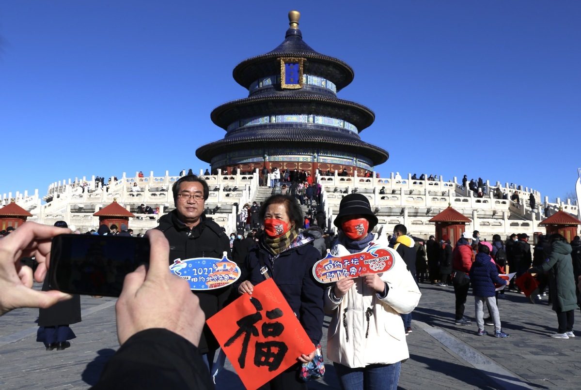 2月1日,游客在北京天坛公园祈年殿前为冬奥加油祈福。 中国日报记者 武晓慧 摄