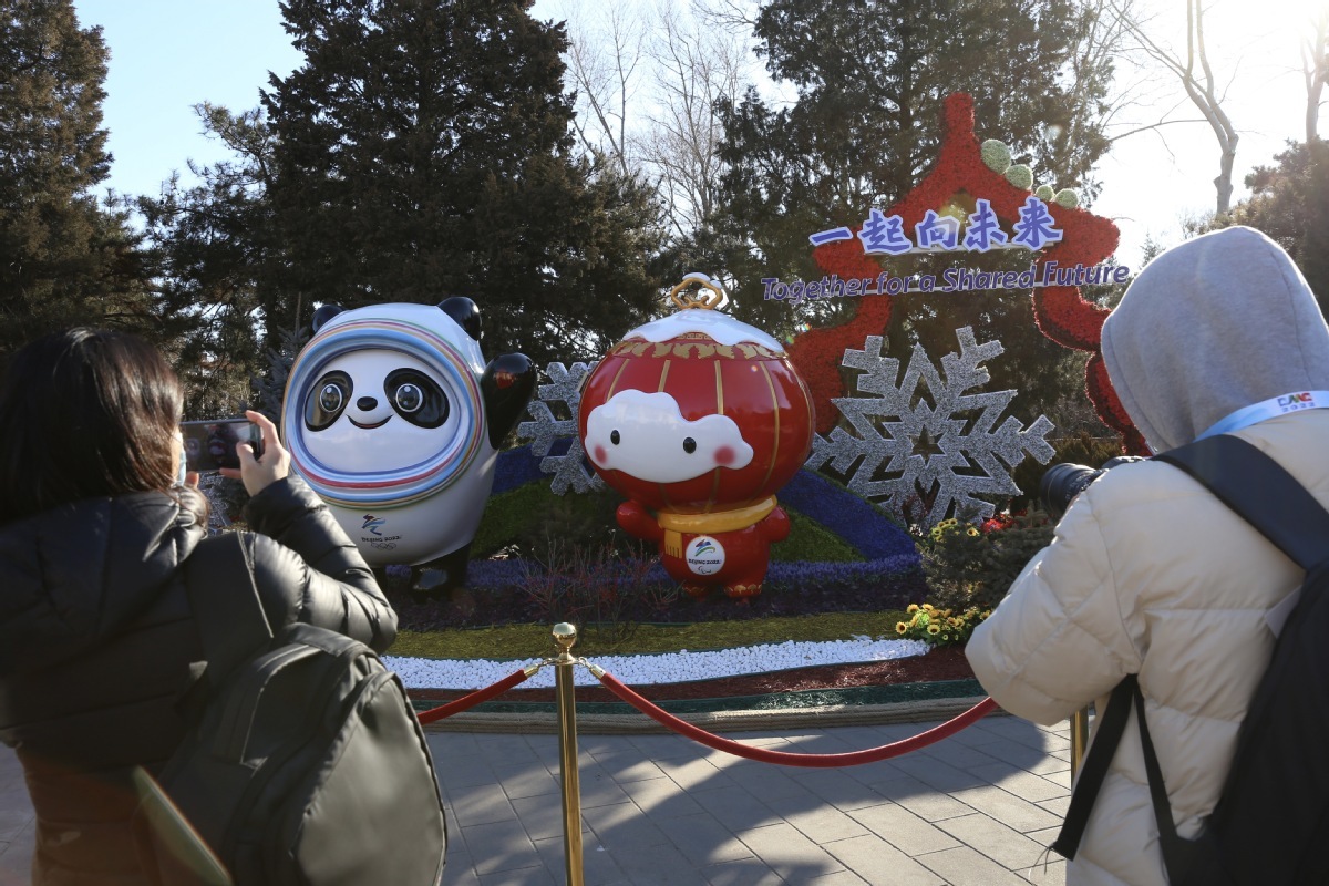 2月1日,游客拍摄北京天坛公园冬奥主题花坛。 中国日报记者 武晓慧 摄