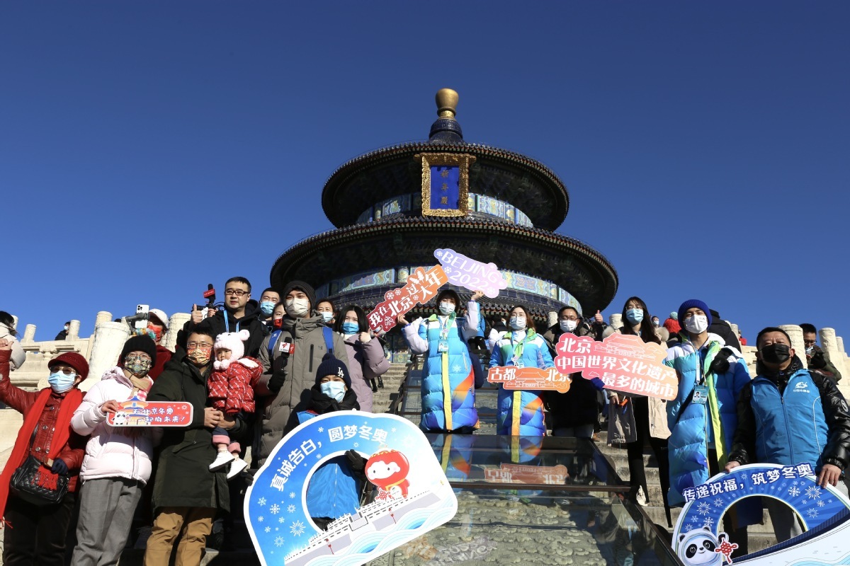 2月1日,北京冬奥城市志愿者、天坛公园志愿者、媒体记者和游客在天坛公园祈年殿前合影,为冬奥加油祈福。 中国日报记者 武晓慧 摄