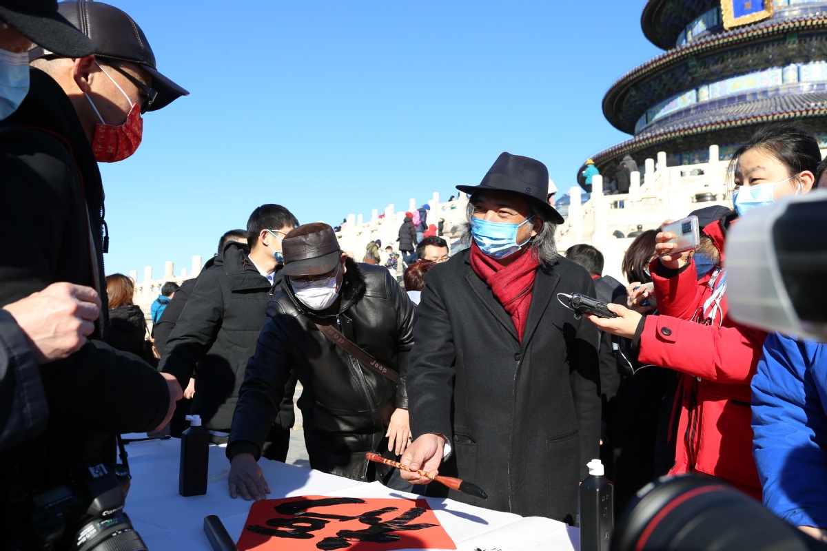2月1日,中国美术馆馆长吴为山(中)为游客写福字送祝福。 中国日报记者 武晓慧 摄