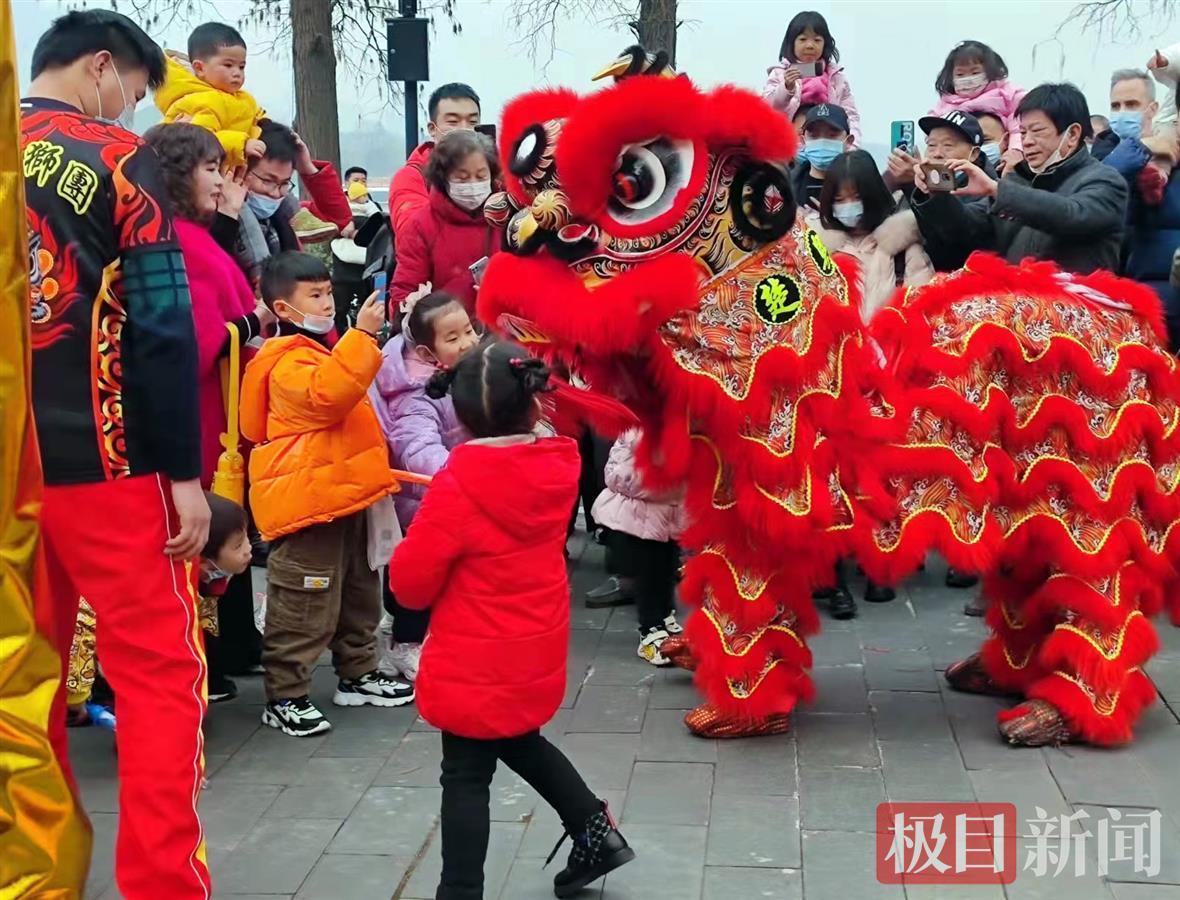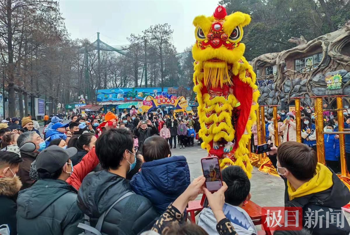 在武汉东湖海洋乐园门前广场上,锣鼓喧天,两只活灵活现的狮子昂首阔步入场,只见它们身着彩色霞帔,跳跃、翻滚、嬉戏,动作神态惟妙惟肖,现场喝彩连连。彩狮与观众互动,市民们纷纷上前摸摸狮头、碰碰狮尾,沾沾新年的福气。
