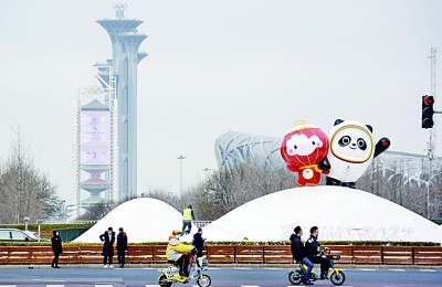 北京奥林匹克景观大道南端的“冰墩墩”和“雪容融”景观。新华社记者 李欣摄