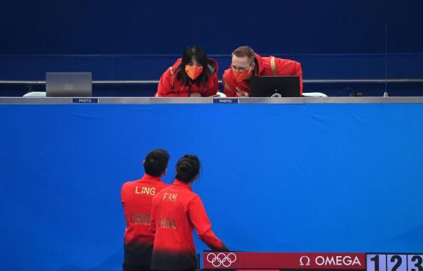 ↑2月2日,中国队选手凌智(前排左)、范苏圆(前排右)接受教练指导。新华社记者 黄孝邦 摄