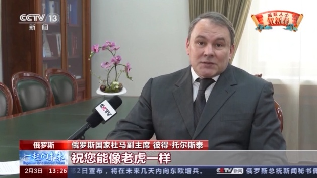 俄罗斯国家杜马副主席彼得·托尔斯泰:祝您能像老虎一样拥有勇气、信心,力量和优雅。即将在中国举行的冬奥会成为了全世界的焦点,希望各国运动员们能公平竞争,也希望他们能取得好的成绩,祝愿本届冬奥会圆满成功。虎年大吉,虎年快乐!