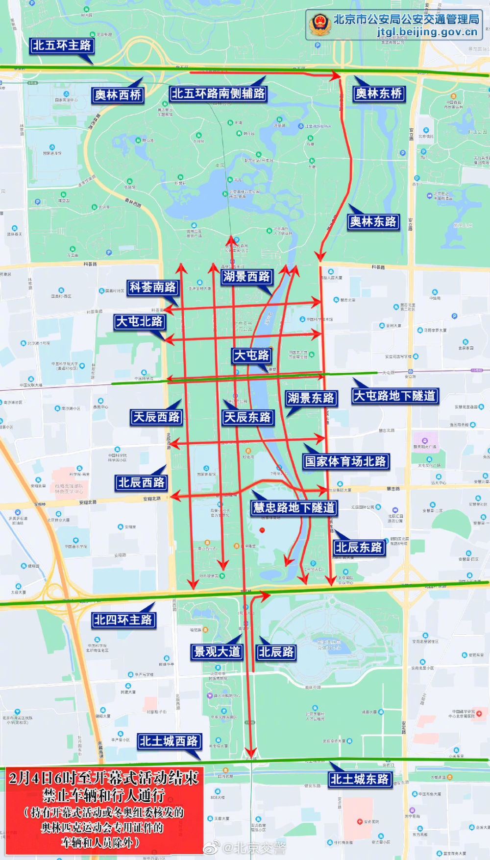 此外,6时至开幕式活动结束,慧忠路地下隧道、国家体育场北路、大屯路(不含大屯路地下隧道)、大屯北路、科荟南路、北五环路南侧辅路(奥林西桥至奥林东桥)、天辰西路、景观大道、天辰东路、湖景西路、湖景东路、奥林东路北向南方向主辅路、北辰东路北向南方向主辅路、北辰路南向北方向主辅路(民族园路至北辰桥),除持有开幕式活动或冬奥组委核发的奥林匹克运动会专用证件的车辆和人员外,禁止其他车辆和行人通行。社会车辆和公交车可经大屯路地下隧道、北四环路、北五环路主路及北侧辅路、北土城西路、北土城东路绕行。