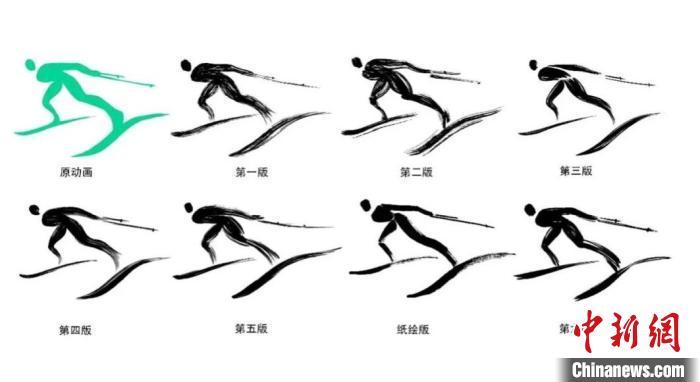 如何实现高质化呈现?水墨动画团队必须在原有的水墨过度呈现“枯笔化”效果的基础上,强调对人形“中国风生命的模拟”和“水墨化动感的展现”。这意味着,他们不仅要对过去二十三届冬奥会动画人形定帧进行修改,对运动帧人形也要进行优化。他们继续在原有水墨人形的基础上,通过数字笔刷与毛笔绘制相结合的方式,强化了笔画连、顿笔之间所呈现的生命节奏和丰富变化。