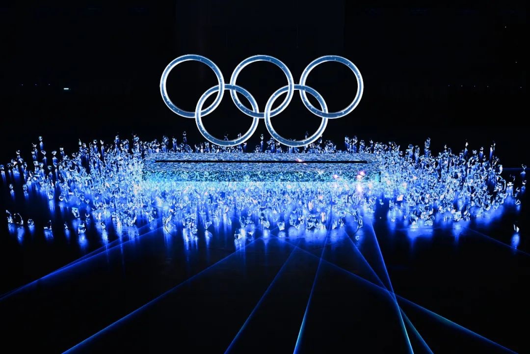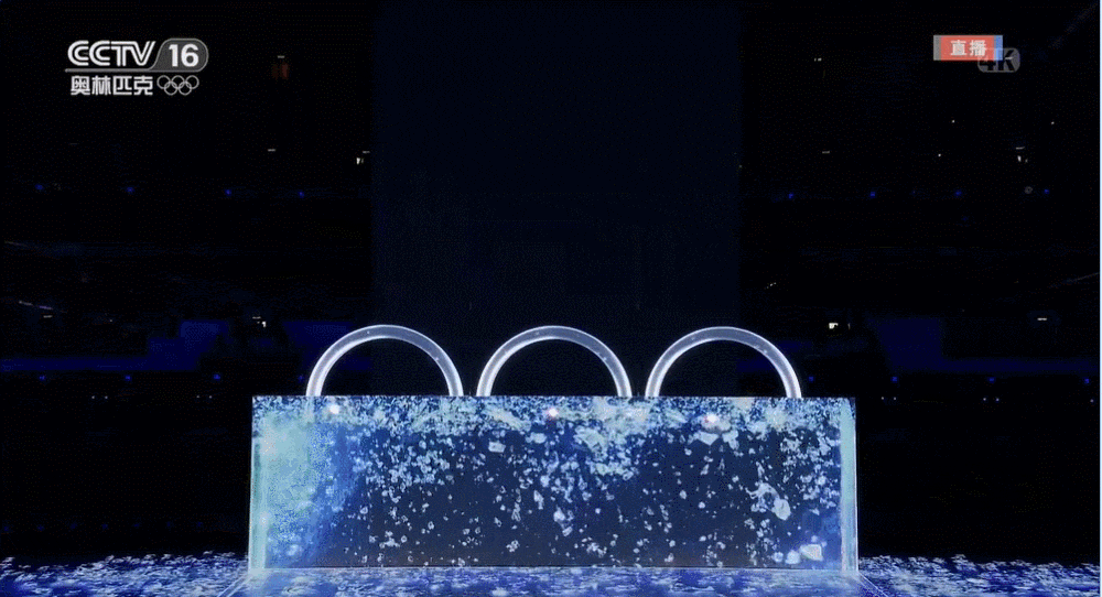 开幕式上,冰球运动员对准冰立方挥杆一击,晶莹剔透的“冰雪五环”破冰而出,将现场气氛推向高潮。