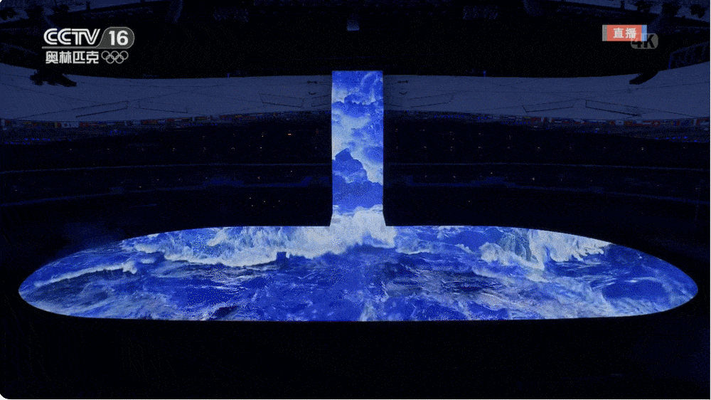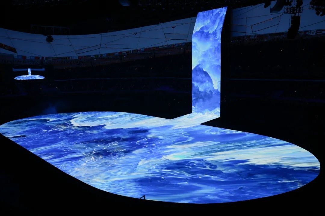 开幕式上,在国旗入场和奏国歌环节之后,现场竖屏上,一滴蓝色的水墨从天而降,幻化成黄河之水倾泻而下,整个场地都奔腾着滚滚而来的黄河之水。