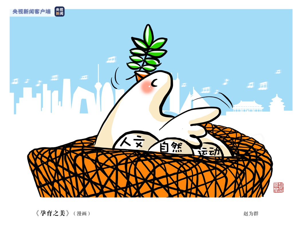 冬奥是在和平中孕育的世界盛会,赵为群创作的《孕育之美》,鸟巢中的和平鸽寓意着冬奥之光将照亮全人类追求团结、和平、友谊的前行之路。