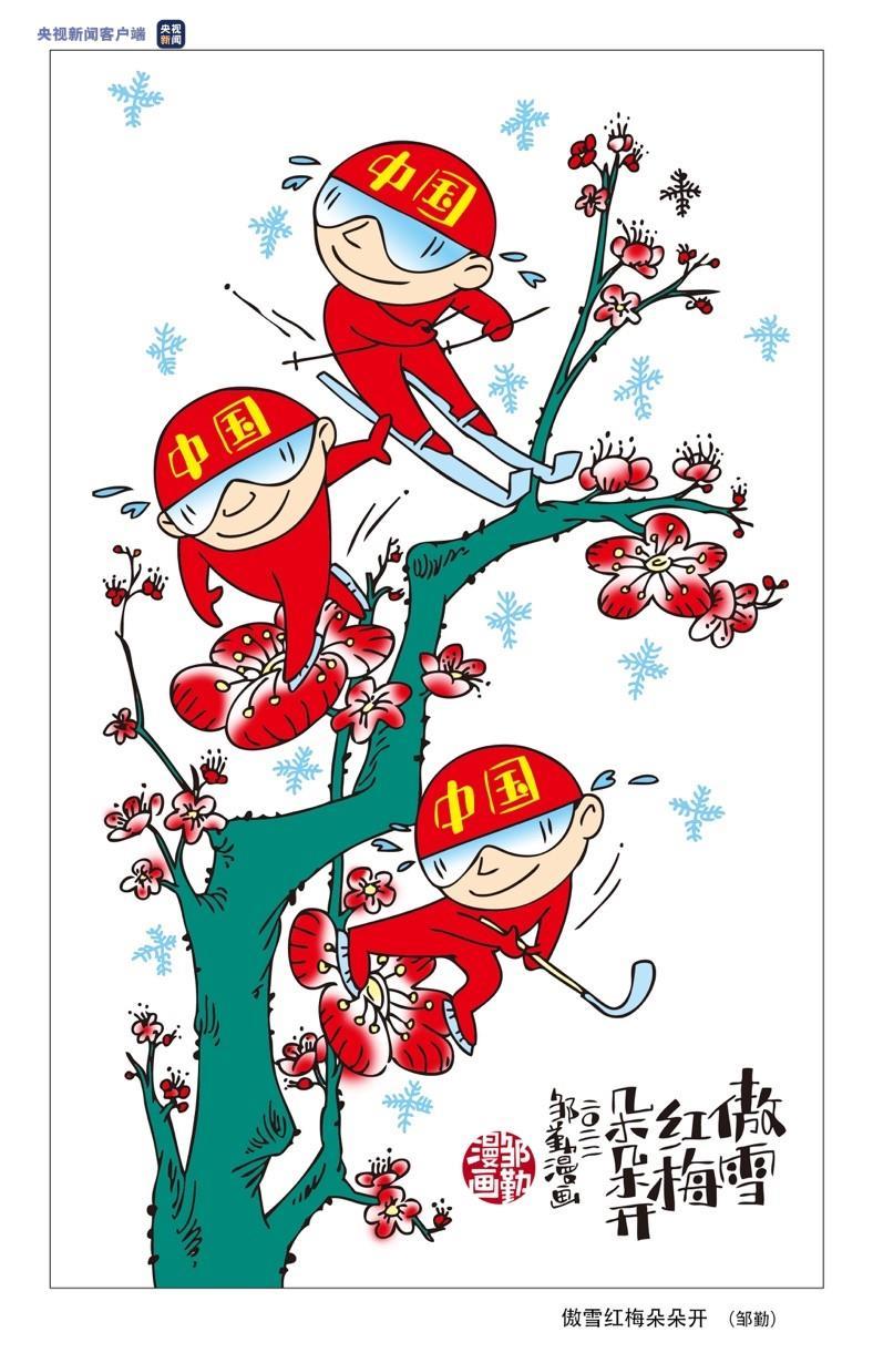邹勤创作的漫画《傲雪红梅朵朵开》,在昨日开幕式上中国代表队的一袭红衣与画中的红梅相映成趣,希望中国的奥运健儿们能够打响“开门红”!