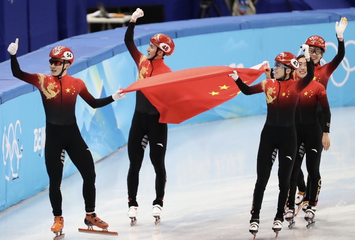 中国日报北京2月5日电(记者 张威)2022年2月5日,在首都体育馆举行的北京2022年冬奥会短道速滑项目混合团体接力决赛中,中国队夺得冠军。