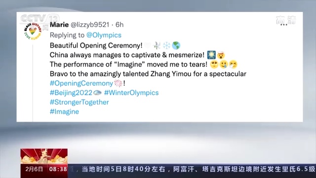 很多美国网友被北京冬奥会开幕式的精彩感动。有网友评论说:“开幕式太精彩了!中国总有办法让观众着迷!开幕式的表演《想象》甚至让人感动落泪!”