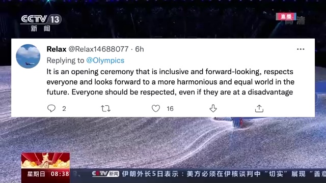 还有美国观众表示,北京冬奥会开幕式的精彩表演让人印象深刻,其所诠释的理念也引起全世界人民的共鸣。