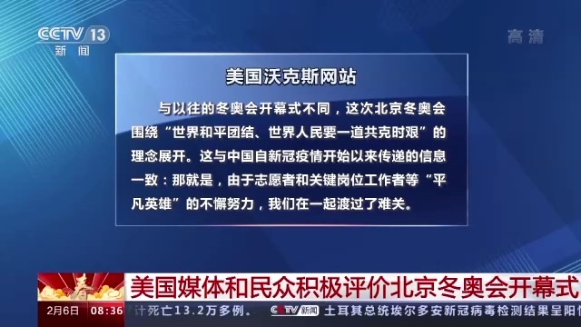 很多美国媒体对北京冬奥会开幕式进行了关注报道,并对北京冬奥会在疫情特殊时期将全世界团结起来的重要意义作出了积极评价。