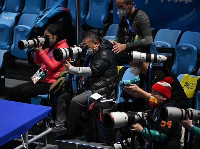 2月5日,记者兰红光(中)在拍摄北京2022年冬奥会短道速滑项目。新华社记者杨磊摄