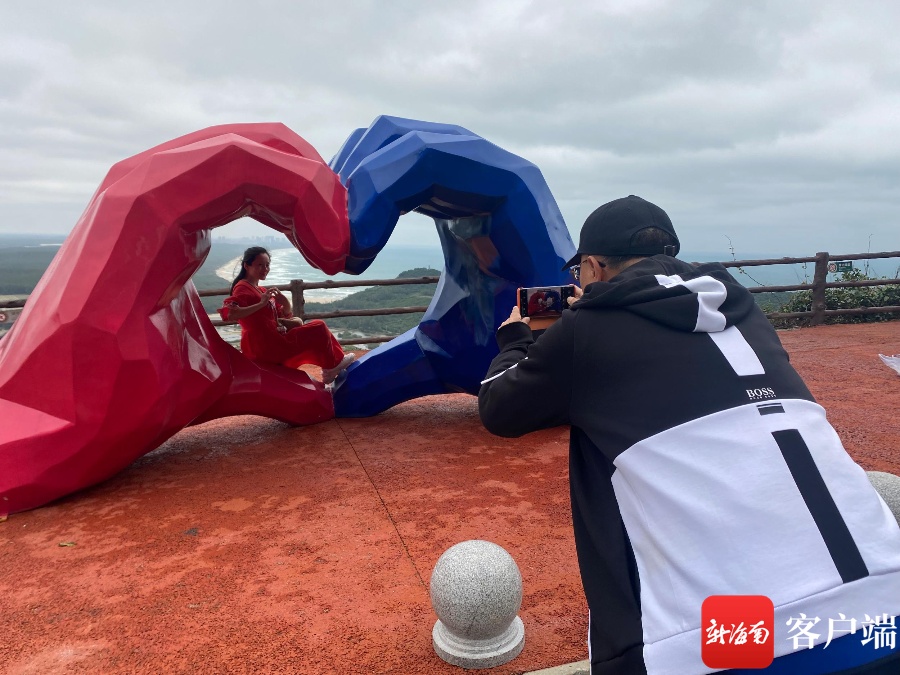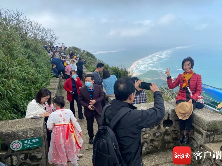 铜鼓岭景区沿途步道上游人络绎不绝,热闹非凡,他们边走边拍,边说边笑,好不惬意;观海长廊和揽月台也吸引着大量游客前来登高赏景,在这里,既可以观赏铜鼓岭的山峦叠翠,又可以远眺月亮湾、淇水湾、文昌航天发射场,是拍照留影的打卡地。