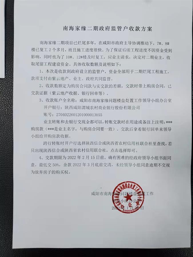 6日下午,领导小组办公室成员、咸阳市信访局负责人赵先生向极目新闻解释,为了解决南海家缘二期烂尾多年的问题,2021年8月咸阳市专门成立了该办公室,前期通过动员企业垫资,推动了两栋楼的复工。“后期的建设,目前政府也没有这么多资金去垫付,所以决定收取建设资金。”赵先生称,此次收取的资金将放在政府设立的监管户,且全部用于二期烂尾工程施工,款项支付由紫云地产、业主、政府共同监督。