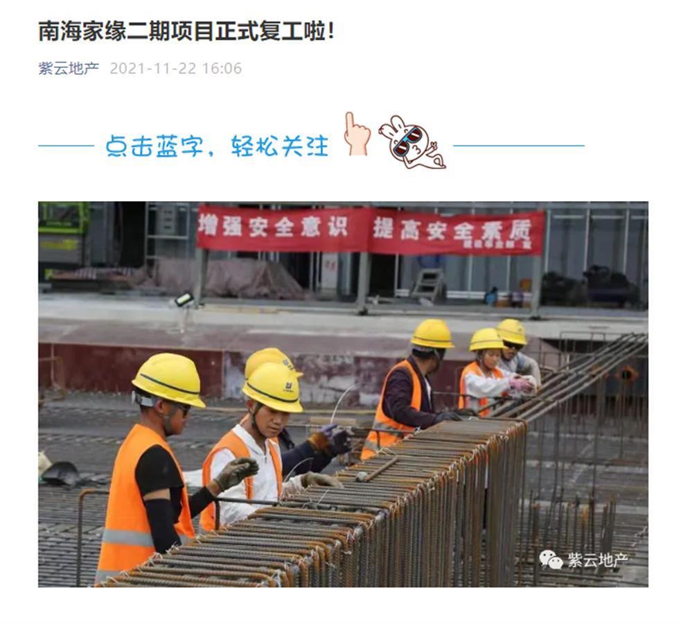 周先生提供的一份《南海家缘二期问题处理公告》显示,7号楼和8号楼已经于2021年11月正式复工,预计将在2022年6月底前交付使用;同时,10号楼和12号楼的复工问题,工作也在有序推进。
