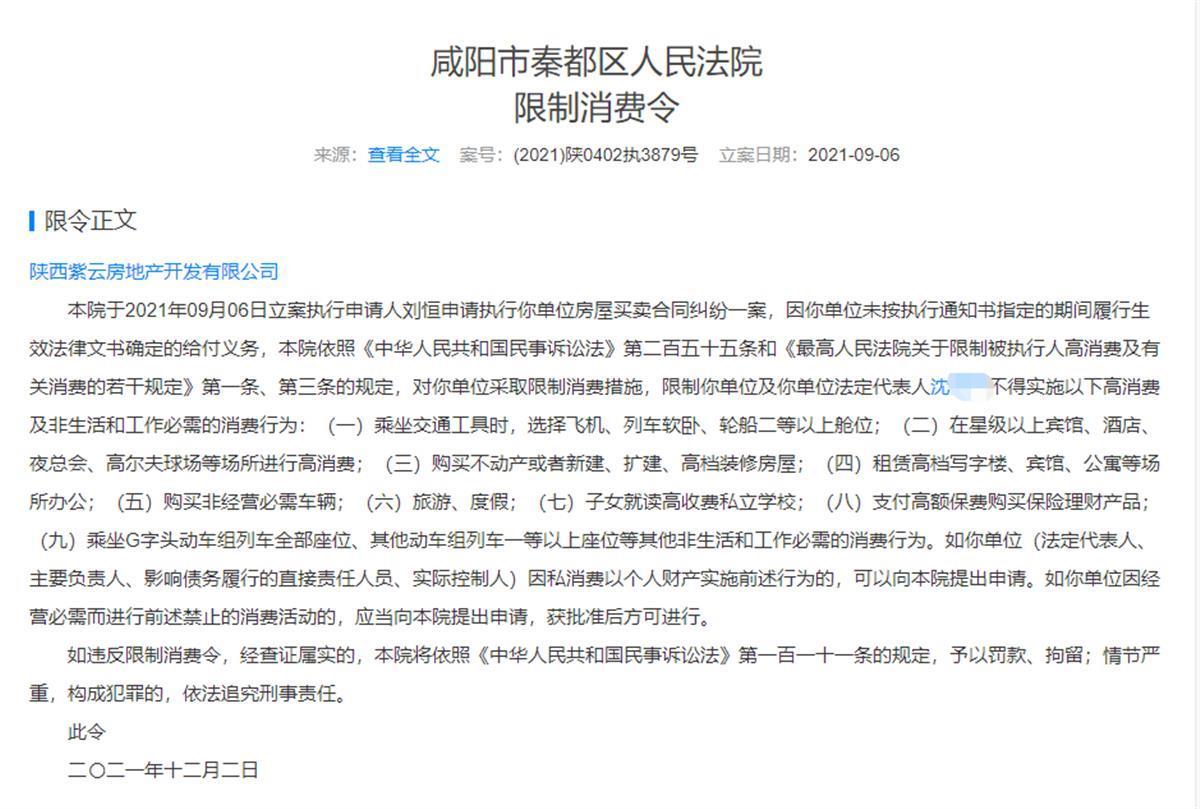 根据天眼查信息,陕西紫云房地产开发有限公司成立于2003年,注册资本2000万元。目前,该公司已涉多起房屋买卖合同纠纷,其法定代表人也因相关纠纷被法院限制消费。