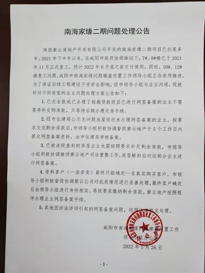 前述的《公告》,落款为咸阳市南海家缘问题楼盘处置工作领导小组办公室(下称领导小组办公室),落款时间为1月26日。《公告》提出,为了保证后续工程建设不受资金影响,要求未办理网签备案的业主在交完剩余房款后,由市领导小组积极协调督促紫云地产于5个工作日内提交网签备案资料,由市住建局审核备案。
