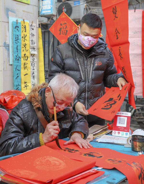 《街头写对联的老人》 春节期间, 花楼街 ,为滿足人们对个性对联的需求,年近八旬老人在街头冒着寒冷低温书写对联。 城市摄影队 程汉庭 摄