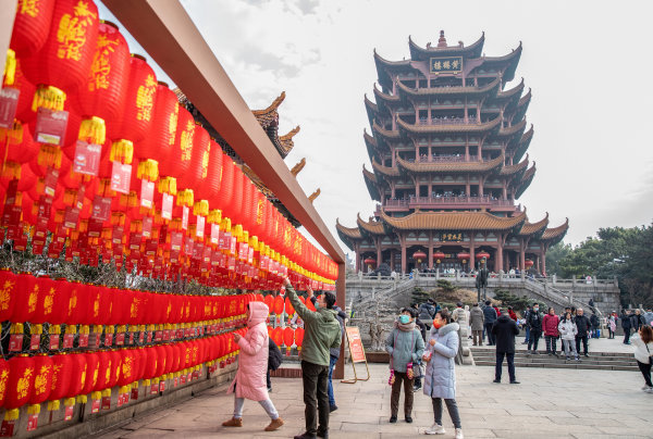 《虎年的祁福》2月5日 黄鹤楼公园,黄鹤楼是大武汉的名片,外地人到武汉都要去黄鹤楼参观,春节期间更是游人如织,祁福的红灯笼衬托着雄伟的黄鹤楼。 城市摄影队李云堤 摄