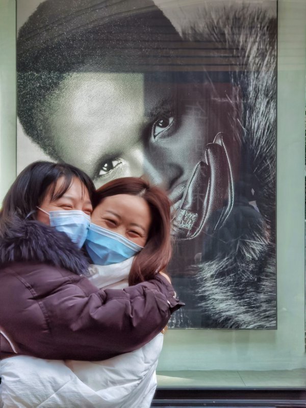 《新春喜相逢》2月4日, 楚河汉街,立春这天,阳光明媚,楚河汉街游人如织,当时我正准备用临街的这幅图做背景拍摄,忽听见一名女子远远地叫唤了一声,前面的女子惊喜地应答着,两人跑到一起紧紧相拥,然后互挽着手,欣喜地离开。城市摄影队 陈泉 摄